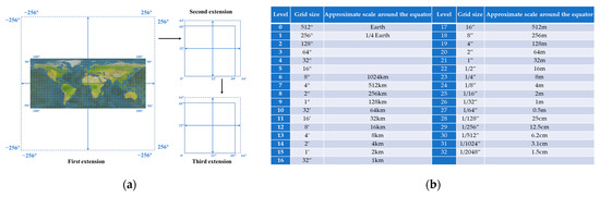 The Beidou grid is divided into 32 levels, and the 0-level grid corresponds to the entire Earth’s three-dimensional space, which is defined as: In the Earth’s three-dimensional space based on latitude and longitude coordinates, the 512° square is coincident with its origin (the intersection of the equator and the prime meridian), the longitude space is extended from [−90,90]° to [−256°,256°], the latitude space is extended from [−180°,180°] to [−256°,256°], and the height of space is 0° from the center of the Earth and goes up to 512°; as the level deepens, the space is continuously divided into 8 equal parts until 1/2048 s. After multi-level division, the space up to 50,000 km and the three-dimensional space down to the center of the Earth are divided into three-dimensional grids of different granularities. Figure 1b shows the grid size of each level of Beidou and its approximate scale around the equator. Levels 10–15 are graded grids, levels 16–21 are second-level grids, and levels 22–32 are sub-second grids. The hierarchical grid root node is a 9-level grid, and the second-level grid root node is a 15-level grid.