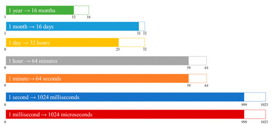 The time-division coding model refers to the multi-scale temporal segmentation coding model. In 2016, Wang Lin proposed a set of time-division coding models in his doctoral dissertation. The essence of this subdivision model is the time binary tree subdivision: in the limited time domain (65,536 BC to 65,535 AD), the binary tree subdivision of year, month, day, hour, minute, and second are realized by extending the time base 7 times (1 year to 16 months, 1 month to 32 days, 1 day to 32 h, 1 h to 64 min, 1 min to 64 s, 1 s to 1024 milliseconds, and 1 millisecond is extended to 1024 microseconds). A time-slice binary tree is formed from the time scale of 60,000 years after BC to the time scale of 1 microsecond, thus forming a multi-scale and unified discrete-time coding system. The multi-scale time division code consists of 64 levels, and this code adopts the Gregorian calendar standard and the UTC time standard [9,36]. The seven virtual extensions of time are shown in Figure 2.