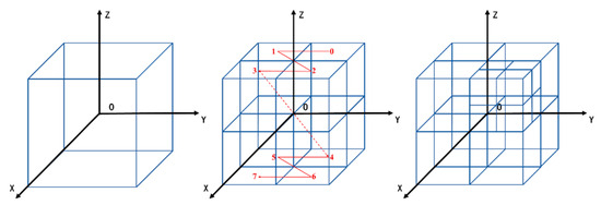 The indoor local meshing framework in this paper is based on Beidou meshing. The grid center of an indoor Beidou mesh is used as the origin of the indoor local coordinate system, and the latitude and longitude directions of the center point are used as the X-axis direction and the Y-axis direction, respectively. The Z-axis of the local coordinate system adopts the CGCS2000 geodetic elevation system. This is consistent with the Beidou framework and can be converted to and from the global geographic coordinate system. In terms of subdivision ideas, indoor local mesh subdivision also draws on the idea of Beidou subdivision framework. In essence, it is still the octree division of the grid. Figure 3 shows the levels of indoor partial division.