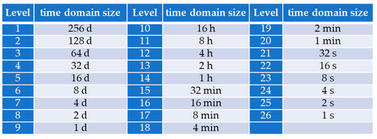 The division principle of indoor local time division model: referring to the Beidou time encoding model, the difference in this article’s method is that in order to facilitate the calculation of time relationships, the month unit has been removed, and in the local time subdivision model, there are only five scales: day, hour, minute, and second. The virtual expansion of this year is to expand from the original 16 months to 512 days. In addition, considering the smooth transmission of time data between adjacent years, especially within the extended 512 days, including 64 days at the end of the previous year and 64 days at the beginning of the next year. Taking a normal year as an example, 1–64 days out of 512 are the last 64 days of the previous year, 65–429 days are the 365 days of the current year, and 430–493 days are the first 64 days of the next year. The remaining days are considered virtual delays. Through this approach, time data can be more effectively smoothed into annual data conversion. In time domain partitioning, indoor local time partitioning models also use binary partitioning to partition time. The level of indoor time division is shown in Figure 5.