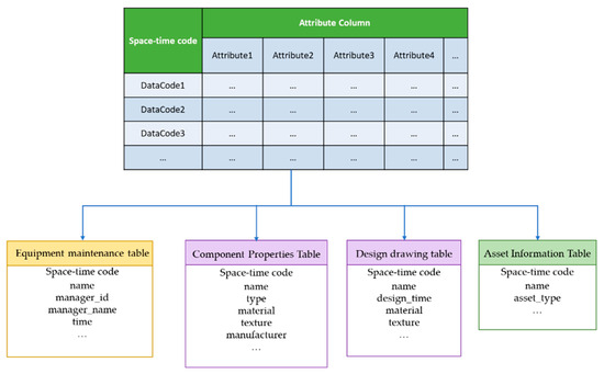 By the use of the table, the grid coding can be used as a foreign key to realize the mapping of indoor objects to space–time grids and the mapping of space–time grids to indoor objects, consequently realizing the unified management of indoor space–time, and the multi-source data can be efficiently associated, as shown in Figure 6.