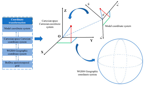The experimental data used in this paper are the BIM model of Guanlan Commercial Street in Baiyin City. To establish a link between the BIM model and the BeiDou grid, a coordinate transformation is required to enable the grid to associate data in the BIM model. Coordinate conversion refers to the transformation of model object data into grid space location and grid space attributes. In the process of converting the grid space location, it involves the conversion of the central coordinate system where the original model is located, the Earth’s Cartesian coordinate system, and the coordinate conversion between WGS84 geographic coordinate system and BeiDou grid code, as shown in Figure 8.