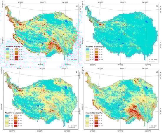 Seasonal mean SCF on the TP in spring (a), summer (b), autumn (c), and winter (d).