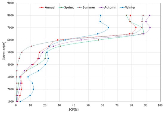 Annual and seasonal mean SCF with elevations on the TP.