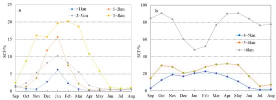 Mean SCF at an altitude of 3–4 km is considerably higher than that below 3 km altitude. In this elevation zone, snow cover starts to increase from September and reaches the highest in February, followed by a rapid decrease after March, and the lowest value is in July. Mean SCF variation in this elevation zone also shows a unimodal distribution within the snow season, as shown in Figure 6a. At an altitude of 4–5 km, the highest monthly mean SCF does not occur in winter months but rather in November with a SCF of 25.5%, followed by March with a SCF of 24.3%, and the next is February and January, respectively. The intra-annual variation presents a bimodal distribution, with two peaks in November and March, respectively, as shown in Figure 6b. Mean SCF at an altitude of 5–6 km is 25.4%, and monthly mean SCF increases remarkably at an altitude of 5–6 km, especially in the transition seasons (autumn and spring), whilst the monthly variation of SCF also shows a bimodal pattern.
