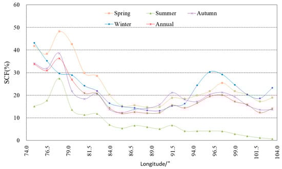 Longitudinal distribution of annual and seasonal mean SCF on the TP.