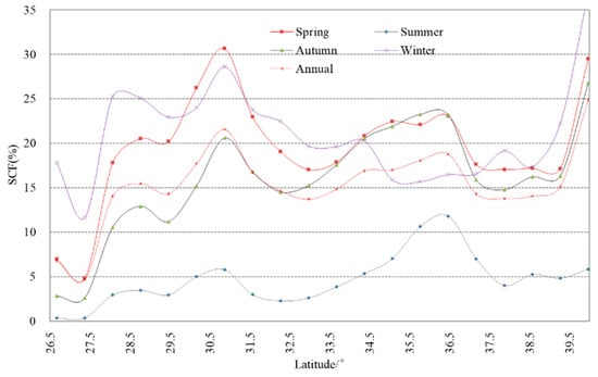 Latitudinal distribution of annual and seasonal mean SCF on the TP.