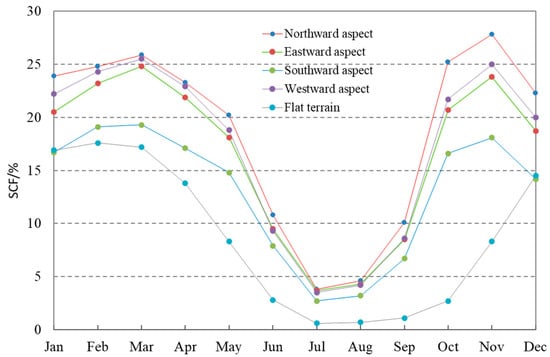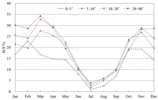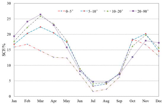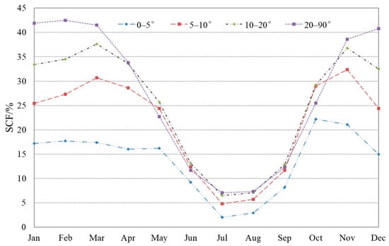 On the south-facing aspect, mean SCF on the different slope zones is less than that of other aspects. Mean SCF on the slope below 5° is 15.9% in January and the maximum is 18.5% in October, while on the slope above 20°, it is 19.4% in January, and the maximum reaches 26.4% in March. Monthly mean SCF on the different slope zones on the south-facing aspect present a bimodal distribution, and two peaks on the slope below 5° appear in October and February, while on the slope zones above 5°, the two peaks occur in November and March, which means that intra-annual SCF peaks occur one month later on the higher slope zones (Table 5 and Figure 12). Moreover, the higher the slope, the higher the mean SCF that is only found in winter and early spring, whereas this pattern is not obvious on the different slope zones during the periods of snow accumulation and snow melting.