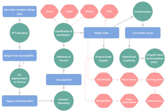 Figure 1 shows the workflow of MADAME, which consists of several stages. In brief, the analysis begins with raw radar complex (I & Q) voltage data, which are marched through a variety of processing algorithms. It concludes by revealing the physical characteristics inferred from the detected meteors. In Figure 1, the blue squares indicate the results of the intermediate steps that can be presented as plots, processing algorithms, and techniques are represented in green circles, and the red hexagons are the final outputs.