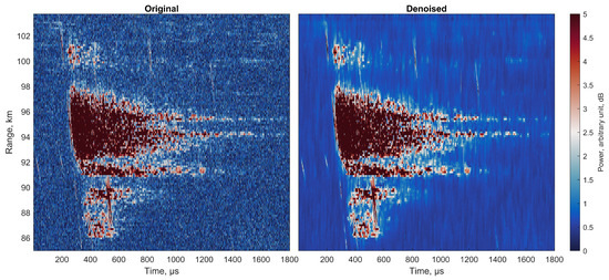 The RTI was constructed by horizontally placing the adjacent decoded radar RXs in the fashion of an image. The RTI was first adjusted by linear contrast that saturated the top and the lower 10% of all the pixels. Doing so made the weaker meteor echoes more prominent and prevented the strong echoes from saturating the dynamic range of the RTI. Then, the RTI was treated by the DnCNN, which is a feed-forward denoising convolutional neural network [29]. As the training set has to be manually labeled, the main purpose of the Gaussian denoising is to prepare the dataset for manual labeling, as it was easier to find meteors on the denoised image. Since the training set was treated by the Gaussian denoising, the testing set was treated the same. Figure 2 shows a comparison between the before and after Gaussian denoising. The denoiser retained nearly all the features of the meteor trail while significantly reducing the noise.