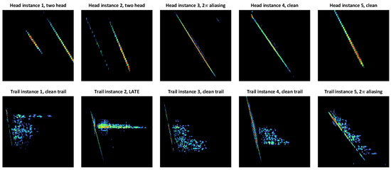 The following steps were taken to obtain the clean set of meteor samples, i.e., the data points corresponding to meteor echoes only. First, the data points were retrieved by their bounding boxes returned by the detector. Then, the pixels with a power lower than a percentile threshold were set to 0. The thresholds were the top two percent for head echoes and the top five percent for trail echoes, respectively. Next, the remaining image was processed by a set of morphological filters through closing/opening [38] to remove noise while retaining the main structure. The images shown in Figure 4 demonstrate a few sample results after morphological filtering. Lastly, the remaining pixels served as the reference to locate the corresponding raw radar complex voltage data for further interpretation.