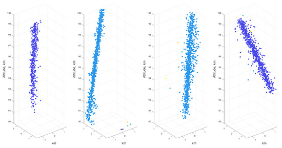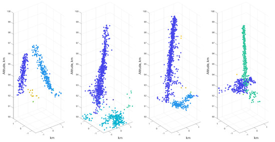 As seen by the examples in Figure 6, there could be multiple objects in the 3D scatter clouds derived from one set of meteor samples. To separate these objects, each 3D scatter cloud was processed by single-linkage clustering [39] to identify the individual events. Single-linkage clustering is one of the many approaches used in hierarchical clustering analysis. It is an unsupervised learning technique that seeks to build a hierarchy of clusters, i.e., it allocates scatters into groups. The single linkage connects the nearest scatter to the closest parent scatter group, which is suitable for separating scattering clusters that have some distance between each other. The scatter groups are represented in different colors in Figure 5 and Figure 6.