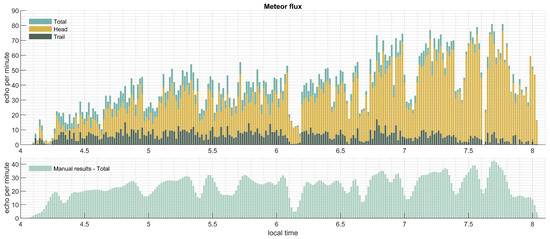 Meteor fluxes from the May 2006 Jicamarca ISR meteor campaign are presented. In the upper panel, the “Total” bars in blue represent the overall number of meteors, irrespective of their class. Meteor head echoes and trail echoes are distinguished by yellow and dark green, respectively. The lower panel displays the meteor flux by manually selecting meteors. The time resolution was interpolated from 200 s to 60 s.