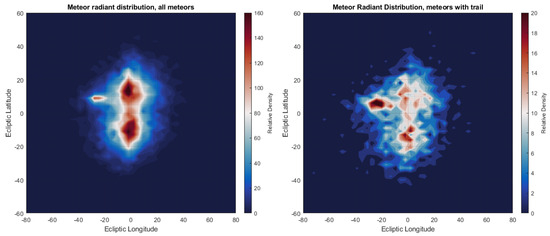 Meteor radiant distribution of all meteors (left panel—18,611 events) and of meteors with trails (right panel—2886 events). As depicted in the right panel, the radiant distribution of the trail meteors showed a relatively stronger concentration at the shower meteor source (Eta Aquarids meteor shower, Lon., Lat.).
