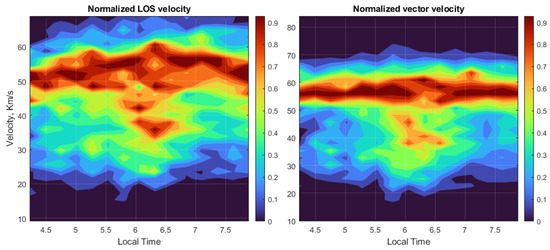 The normalized LOS velocity (left panel) and vector velocity or absolute velocity (right panel) distribution of the meteor head echoes. The distributions were normalized by their respective local time, i.e., by the vertical columns of the image.