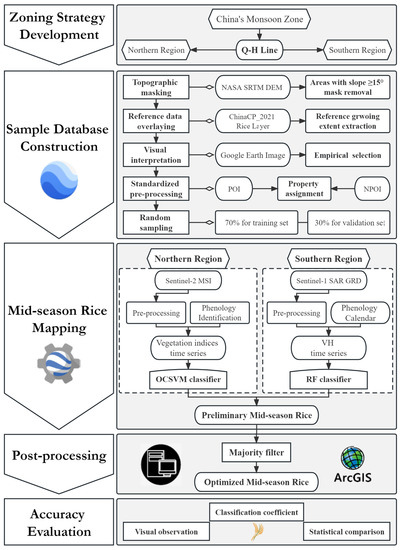 The overall technical route of this study (shown in Figure 4) involved 5 steps: zoning strategy development, sample database construction, mid-season rice mapping, post-processing, and accuracy evaluation.
