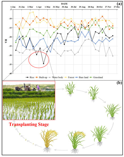 Experiential knowledge has suggested that the range and trend of VH backscatter are promising features with which to distinguish rice from other types of land cover [70,71]. This was demonstrated by the low value of VH in rice pixels during the transplanting stage due to the inundation of water (Figure 6b). Subsequently, due to the growth of rice, the volume scattering of the plants gradually improved, and the backscattering increased significantly during the growing stage. Finally, the backscattering decreased due to the surface scattering from the bare land that remained after the rice had matured and been harvested [72]. Therefore, this “V”-shaped falling–rising feature of VH is the key factor for rice field identification in the cloudy southern region. To visually represent this feature, a script to view the VH backscattering time series profile at the target site over 2021 was developed on the GEE. Figure 6 shows the VH backscatter time series profiles for various land cover classes including mid-season rice in a region of Anhui Province, where the typical “V” shaped fluctuations can be seen in the red circle in Figure 6a; the figure also shows that the time coincided with the local rice-transplanting stage. The code for this GEE script can be accessed via the following link (https://code.earthengine.google.com/6f95a8a252182c4d736bcaae47bf2024, accessed on 4 May 2023).