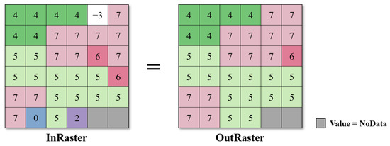 The basic principle of MF is to replace the pixels in the raster based on the mode of neighboring values (Figure 7) [78]. The optional parameters of this tool include “number_neighbors” (which determines the number of neighboring pixels in the filter kernel, whose default value is “FOUR”, which means that the kernel of the filter will be the four direct (orthogonal) neighbors to the present cell) and “majority_definition” (which specifies the number of neighboring pixels that must have the same value, the default value of which is “MAJORITY”, which means that a majority of cells must have the same value and be contiguous). In this study, the two parameters have been set as default values.