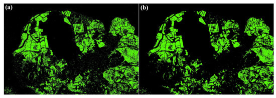 Comparison of mid-season rice-mapping results in a certain district of Jiangxi (116°31′E, 29°8′N) before and after the process of majority filtering. (a) Before filtering. (b) After filtering.