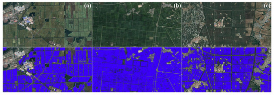 Partial results of mapping the cultivation extent of mid-season rice in 2021 in three typical provinces in northern China against high-definition Google Earth satellite imagery. The blue blocks represent the extracted mid-season rice fields. (a) Heilongjiang Province. (b) Jilin Province. (c) Liaoning Province.