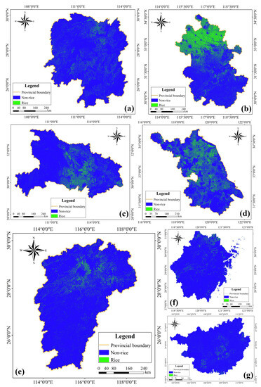 For the southern region, seven provinces (Hunan, Hubei, Jiangxi, Anhui, Jiangsu, Zhejiang, and Guangxi) with highly representative and statistically large areas of rice cultivation have been selected for the presentation of mid-season rice-mapping results and accuracy evaluation due to the space limitation of the paper.