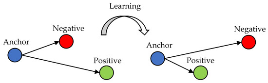 DML combines deep learning and distance metric learning to learn nonlinear features and similarities between data. Triplet loss and contrastive loss [25] have been commonly used in DML paradigms. Compared to contrastive loss, triplet loss can obtain better performance by pulling intraclass samples closer as well as pushing the interclass samples farther, and has been broadly applied in retrieval tasks [26,27]. The optimization process for triplet loss is shown in Figure 3, and the loss function can be represented as: