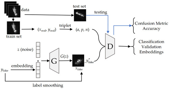 where and represent the generated image and the smooth label of the generated image, respectively, “1” represents the validation label of the generated image, and and represent the trade-off parameters. The discriminator aims to distinguish between real and generated images, classify them, and learn the deep feature embedding of real images and is optimized by the validation loss, classification loss, and triplet loss. Specifically, the discriminator assigns 0 and 1 to the generated image and real image for validation, and the BCE loss serves as the validation loss. The CE loss is used as the classification loss for real images, while the SL-CE loss is used for generated images. The overall loss of the D is formulated as follows: