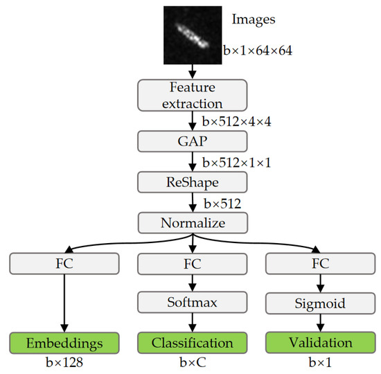The discriminator of the LST-ACGAN adopts a multi-task learning architecture for classification, validation, and deep feature embedding learning. The network architecture of the discriminator is shown in Figure 5. The discriminator mainly includes the feature extraction network and three multi-task learning subnetworks. In this article, the pretrained ResNet18 [30] with the FC layer removed is adopted as the feature extraction network. For input images, deep feature maps are extracted by the feature extraction network and converted into vectors by the global average pooling (GAP) and reshape operations. Then, the vectors are normalized with L2 normalization to stabilize the learning process. Finally, the discriminator outputs the embeddings, classification results, and validation results by the embedding subnetwork, classification subnetwork, and validation subnetwork, respectively. Specifically, the classification subnetwork classifies the input image via the softmax function: