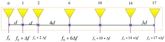 Figure 1 shows the transmit array model of MR-FDA-MIMO radar, where the transmit array is a sparse MRA array composed of M elements, and the receive array is a ULA composed of N elements, with M and N being equal. Table 1 provides the MRA element configuration [32]. Figure 1 shows the 7-element MRA array. The 7-element MRA can estimate the correlation function of 0–17d spatial lags, covering the DOFs of 17d, where d is the inter-element spacing, which is usually taken as half the wavelength. However, the 7-element ULA can only estimate the correlation function of 0–6d spatial lags and can only cover the DOFs of 6d. The DOFs of MRA is obviously larger than that of ULA under the same array element.
