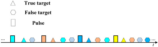 Assuming there are false targets, the angle of each false target is θj, and the range is Rf. Due to the different time delays of the false targets, the Rf values of each false target are different [28,50]. The false targets lag behind the true target by at least one maximum unambiguous range (Figure 3) [28,50,51]. After matching filtering (Figure 2), the echo form of the f-th false target is