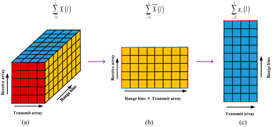 where and represent the reconstruction operators. The transformation of the multi-dimensional dataset is illustrated Figure 4. The data x is transformed into a dimension of NM *L after undergoing matched filtering. Subsequently, the data undergoes the reconstruction operation, resulting in a dimension of N*M*L (Figure 4a). To obtain the receive dimensional data, further reconstruction operation is conducted, leading to a dimension of N*L for the data (Figure 4b). Applying sidelobe interference suppression processing on the receive dimensions allows for obtaining the transmit dimensional data, with a data dimension of M*L (Figure 4c).