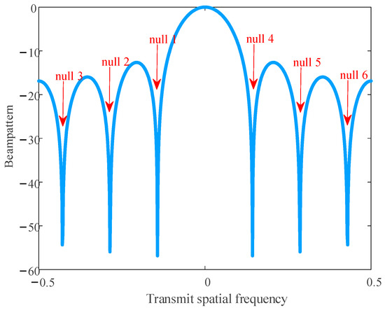 Substituting Equation (21) into Equation (20), it can be concluded that, when the delay pulse of the false target is p, the transmit frequency of the false target corresponds to the frequency of the p-th null of the beampattern. When the delay pulse of the false target ranges from 1 to (M − 1), it corresponds to the 1 to (M − 1)-th nulls of the beampattern, and, thus, can effectively suppress the 1 to (M − 1)-th false targets in Figure 5.