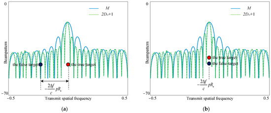 Figure 7 shows the positions of the targets in the transmit beampattern at different numbers of array elements when is used. From Figure 7a, it can be seen that, when p = 4, for the case of M array elements, the false target with 4 delay pulses coincides precisely with the 4-th null of the beampattern. However, for the case of array elements, the false target with 4 delay pulses does not coincide with the 4-th null of the beampattern. When p = M, as shown in Figure 7b, the false target coincides with the true target in the mainlobe of the beampattern regardless of whether the array has M or elements. This is because the frequency increment in Equation (21) is designed based on the physical array. When the delay pulse numbers of the false targets are an integer multiple of M, the true and false targets coincide.