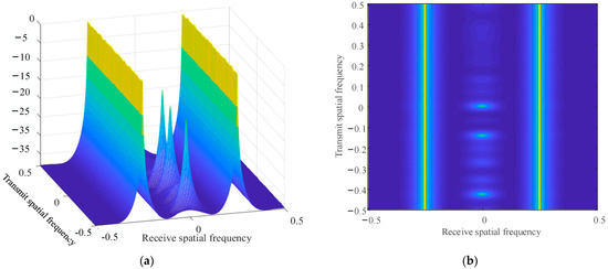 Target and interference power spectrum. (a) Transmit-receive 2-D power spectrum. (b) 3-D power spectrum.