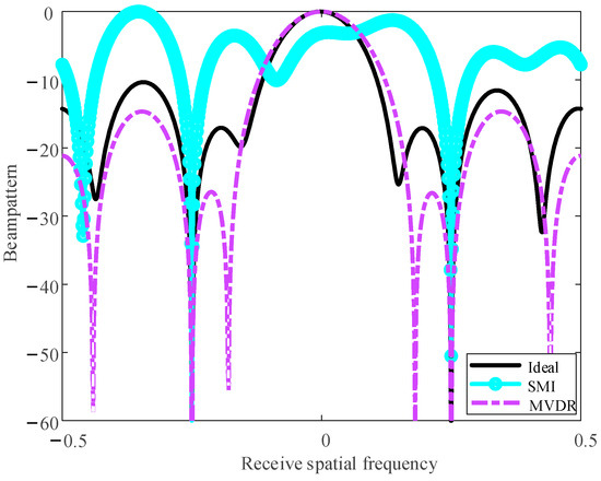 The beamforming results of various methods are presented in Figure 9, demonstrating that both MVDR beamforming and the sample matrix inversion (SMI) [56] method exhibit nulls in the sidelobe interference region. As depicted in the figure, the mainlobe of the SMI beampattern experiences distortion and deformation attributed to the target components present in the training data. In contrast, the robust MVDR beampattern preserves a robust and well-defined shape.
