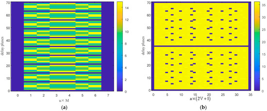 The zones of mainlobe deceptive interference suppression are illustrated in Figure 10. The y-axis represents the number of delayed pulses for the false target, and the x-axis represents (). Additionally, the color indicates the target power and the effectiveness of the interference suppression. Yellow indicates high true target output power, while blue denotes ineffective suppression of the false target. It is important to note that the complete suppression of false targets becomes challenging when the number of false targets exceeds the number of physical array elements. This is evident in Figure 10a where it is observed that the effectiveness of the interference suppression is compromised. As can be seen in Figure 10b, an increase in the number of virtual array elements results in enhanced interference suppression. Notably, in line with theoretical considerations, false targets with delayed pulses are effectively suppressed when , as they align with nulls present in the beampattern. Furthermore, when or , the false target aligns with the true target and becomes indistinguishable, thus leading to an inability to suppress the false target.