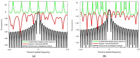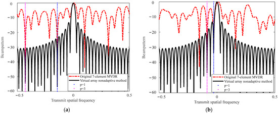 Different Δf values corresponding to the beampatterns are shown in Figure 11. The original 7-element MVDR method is a beamformer that utilizes physical array elements. The virtual array nonadaptive method is a beamformer that utilizes a virtual array. As shown in Figure 11a, for the frequency increment defined by Equation (21), false targets with p (p = 1, 3) delay pulses are situated within the p-th null of the original 7-element MVDR beampattern. However, in the nonadaptive method utilizing the virtual array beampattern, the false targets with p delay pulses do not align with the p-th null, resulting in underutilization of the DOFs provided by the virtual array. Conversely, when employing the frequency increment designated by Equation (28), the false targets with p delay pulses align with the p-th null in the beampattern shown in Figure 11b.