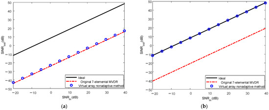The output SINR results under different Δf values are shown in Figure 12. The performance of the original 7-element MVDR method deteriorates at high SNR due to the presence of the true targets in the samples. In contrast, the performance of the virtual array nonadaptive method remains constant and approaches the ideal performance curve. Upon careful examination of Figure 12a,b, it is evident that the original 7-element MVDR method approximates the ideal performance curve at low SNR when . However, when , the original 7-element MVDR method exhibits a decline in performance. By analyzing the beampattern in Figure 11b, it is observed, when and p = {1, 3}, that the first null is in close proximity to the mainlobe, resulting in shifting.