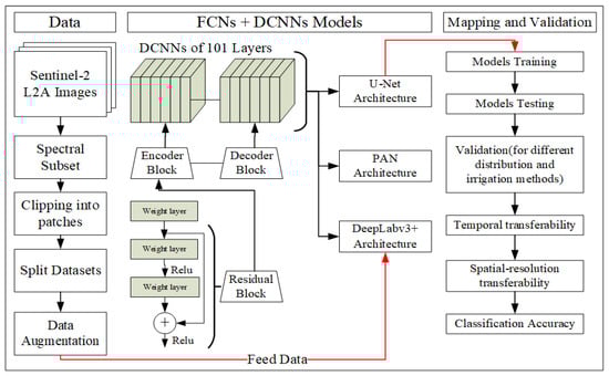 The flowchart of irrigation mapping using three FCNs + DCCNs models and Sentinel-2 L2A images.