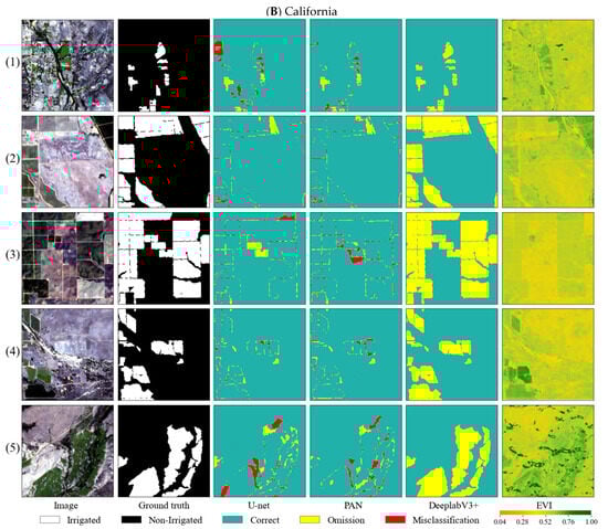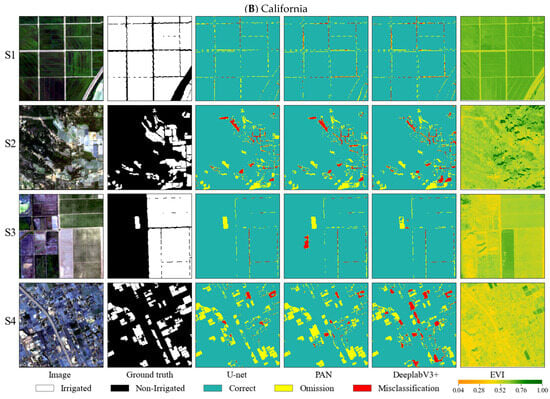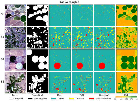 DeepLabV3+ demonstrated a superior performance in California compared to Washington. PAN and U-net exhibited relatively poorer Precision, Recall, and F1-score metrics in California than in Washington. Conversely, the OA and Kappa values in Washington were superior to those in California, as shown in Table 1. Given that the area of Washington is smaller and the sample size was comparatively smaller than that in California, further research is necessary to assess how the intricacy of the regional environment and the sample size affect the deep models’ abilities to learn and identify features of irrigated farmland.