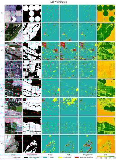 In Washington, we achieved ideal extraction outcomes in the fields served by the Center Pivot (1), Sprinkler (2), Drip (4), Micro Sprinkler (5), and Rill (7) systems, with the exception of gaps in certain plots. These results were primarily achieved due to the well-distributed placement of the plots and their distinct characteristics compared to other land cover types. There were numerous misclassifications and omissions in fields served by Wheel Line (3) systems, which typically irrigate small fields interspersed among other land classes. In the fields served by Wild Flooding (6) systems, DeepLabV3+ demonstrated the best extraction effects, while PAN yielded the most omissions. This irrigation type is distinct from others and is commonly used for pastures and pasture crops, allowing water to flow freely onto plots where the land is not tidied. The fields served by Big Gun (8) systems experienced many omissions in the extraction results of U-net and numerous misclassifications of DeepLabV3+. This irrigation method is employed in plots of almost any shape, as well as areas where the use of other methods proves challenging, particularly in areas where it is difficult to relocate irrigation facilities once the crops have matured, such as sugar cane and corn. In areas with less cumulative precipitation, there are often greater spectral differences between irrigation and other land types (Table 4 and Washington in Figure 6). Different spectral features help to identify irrigation, while the distribution patterns that small fields intersperse among multiple land classes interfere with the distinction between irrigation and other land classes ((1)–(8) in Washington).