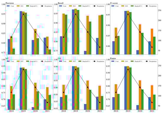 Figure 8 shows the quantitative evaluation metrics for the classification performance of the deep models in different years. The amounts of precipitation for T11SKV in 2018–2021 were 116.49, 230.51, 141.74, and 66.47 mm, respectively. The evaluation results from 2018 to 2021 indicate that for all models, the lowest value of Recall was 0.91, the lowest value of OA was 0.87, and the lowest values of other metrics were 0.73. This indicates that irrigation could be identified correctly in most cases in different years, and only a small number of irrigated fields were omitted. The interval between the prediction year and the training year was longer, while the accuracy in the prediction year was lower. This may be because the time interval was longer and the environmental change was greater. By comparing PAN and DeepLabV3+ in 2020 and 2018, we found that the accuracy was higher in predicted years with more precipitation. This may have been due to more precipitation in training years; the predicted years with more precipitation showed results similar to those of the training years. Among the three models, PAN exhibited the best generalization ability, while U-net displayed the worst, across different years.