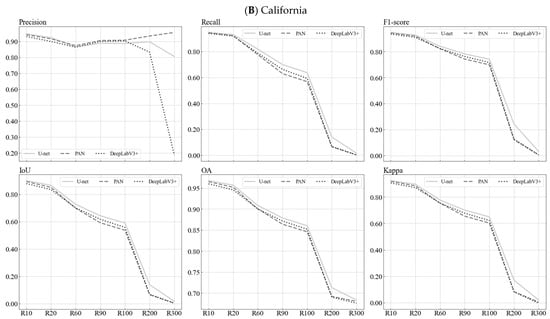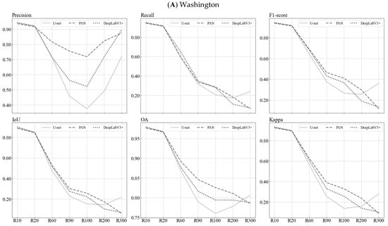 Figure 10 displays the quantitative metrics measuring the classification performance of the deep models at various spatial resolutions. The values of these metrics decreased as the spatial resolution decreased in both study areas. The worst performance occurred at 300 m resolution, except for U-net, which showed the worst performance at 100 and 200 m resolution. The values of these metrics decreased as the spatial resolution decreased in both study areas. The worst performance occurred at 300 m resolution, except for U-net, which had the worst performance at 100 and 200 m resolution. In Washington, the values of all metrics varied very little from 10 to 20 m resolution. From 10 to 60 m resolution, the lowest value of OA was 0.87, that of IoU was 0.52 (excluding U-net), and that of the other metrics was 0.56. U-net demonstrated stability across different spatial resolutions, whereas PAN did not exhibit the same relative stability. The models’ metrics declined rapidly from 20 to 90 m resolution, and their accuracies trended towards stability from 90 to 300 m. In California, the lowest value of Precision and OA was 0.85, that of F1-score was 0.70, that of Kappa was 0.60, and that of Recall and IoU was 0.54 from 10 to 100 m resolution. From 10 to 300 m resolution, the lowest value of Precision was 0.81 (excluding DeepLabV3+), and that of OA was 0.68. U-net achieved the best transferability/portability performance, whereas PAN exhibited the worst relative performance. Unlike in Washington, the models’ metrics remained relatively stable from 20 to 100 m resolution, and their metrics declined rapidly from 100 to 300 m resolution. The generalization performance of the models at different spatial resolutions was better in the region with less precipitation.