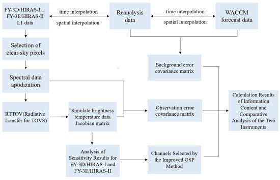 Before conducting the selection of atmospheric gas component channels and the analysis of retrieval capability, we need to process the FY-3D/HIRAS-I observation data, FY-3E/HIRAS-II observation data, EAC4 reanalysis data, EGG4 reanalysis data, and WACCM forecast data. This includes truncating and selecting clear-sky scenes from HIRAS-I/HIRAS-II L1 observation data, interpolating reanalysis and forecast data, and standardizing the units of gas concentrations. After the data processing is completed, we input it into the RTTOV fast radiative transfer model for forward calculation, obtaining simulated brightness temperatures. Then, we conduct sensitivity analysis on the gases in each channel to determine the range of strongly sensitive wavelengths. Next, channel selection is performed to choose channels suitable for each gas. Finally, we calculate the information capacity of each gas and conduct comparative analysis. The overall roadmap is shown in the following Figure 1: