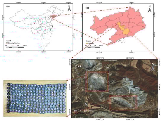 The Anshan area is an important iron ore producing area in China, with its total iron ore resources accounting for about 1/3 of the total iron ore resources in the country. Therefore, this paper takes the Anqian Mine open-pit mine in Anshan City, Liaoning Province, China, as the study area. The geographic coordinates of the mine area are 41°6′32″–41°5′11″ north latitude and 123°7′54″–123°10′5″ east longitude. Figure 1 shows the study area of this paper.