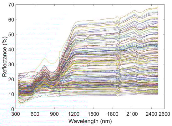 In support of this paper, 200 iron ore samples were collected from different locations in the study area. The sample collection date was 18 September 2022. The iron ore samples were processed by crushing, grinding, and sieving to make 200 powdered iron ore samples, and the samples of the processed iron ore are shown in Figure 1. Then, the samples were subjected to spectroscopic experiments using an HR SVC-1024 spectrometer. The band range was 340–2500 nm. After performing five spectral experiments, the TFE of the powder was determined using potassium dichromate titration. (The executive standard of the Potassium dichromate titration method is GB/T 6730.65-2009). The five spectra were averaged as the final sample spectral data. The original spectral curve is shown in Figure 2.