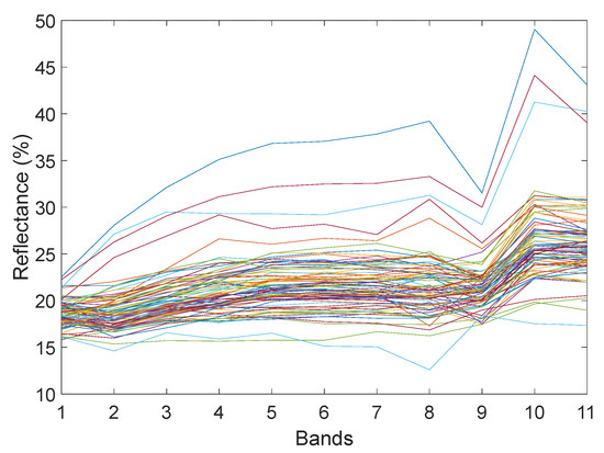 The five-point-sampling method was utilized to obtain the TFE content corresponding to 82 pixel points and to extract the reflectance of 82 pixel points. The reflectance of 82 pixel points is shown in Figure 5.