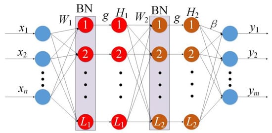 For N samples , , , n is the number of input features, and m is the number of output features. L1 and L2 represent the number of nodes in the first and second hidden layers, respectively, and the node parameters are randomly valued. The weights W1 and W2 have a value range of [−1, 1], and the thresholds B1 and B2 have a value range of [0, 1]. Given the activation function g, the output matrix H1 of the first hidden layer is calculated according to Equation (10).