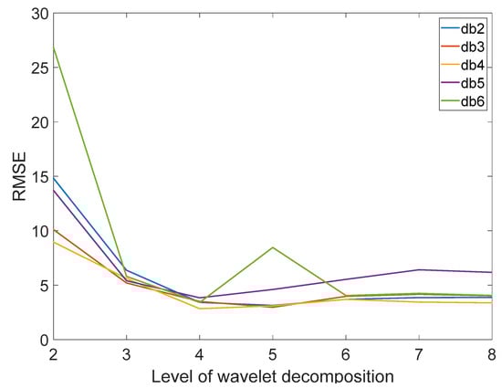 In WT, the dblets wavelets are chosen as wavelet basis functions for the analysis. To determine the number of decomposition layers of the dblets wavelet basis, db2, db3, db4, db5, and db6 are used to process the visible—infrared spectral data. To evaluate the noise-filtering effect, this paper uses the linear regression method to model and analyze the spectra after WT and uses RMSE as an evaluation index. When the RMSE is smaller, it proves that the linear regression fit is better, and the de-noising effect is better. In this paper, the spectral signals are processed using db2, db3, db4, db5, and db6 with decomposition levels from 2 to 8.