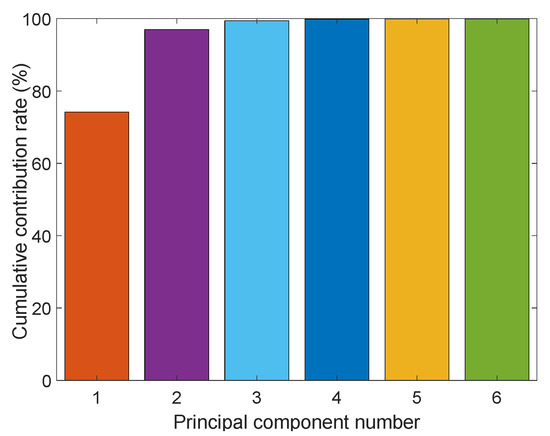 The spectral experiments are conducted in the band range of 340–2500 nm, and the visible—infrared spectral data are 973 dimensions. The three-dimensional data at 340 and 2500 are removed because of the high noise contamination of the spectral data at these two bands. However, the 970-dimensional data have the problems of information redundancy and multicollinearity. If the 970-dimensional data are used as input, the accuracy of the algorithm will be reduced. Moreover, to match the high-dimensional input features, ELM needs to set a large number of hidden layer nodes, which will cause a redundant network structure and reduce the generalizability of ELM. Therefore, this paper uses PCA to reduce the dimensionality of 970-dimensional data. In this paper, the cumulative contribution rate is set to 99.9%, and six-dimensional features are extracted. The extracted features are shown in Figure 11. These six-dimensional features will be used as input features for subsequent iron ore detection model building.
